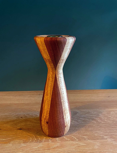 Myrthe werkt creatief samen met Peter draait door. Op de Vint’Art Markt zijn lampen te koop die zijn samengesteld uit de kappen van Myrthe en een door Peter houtgedraaide voet.