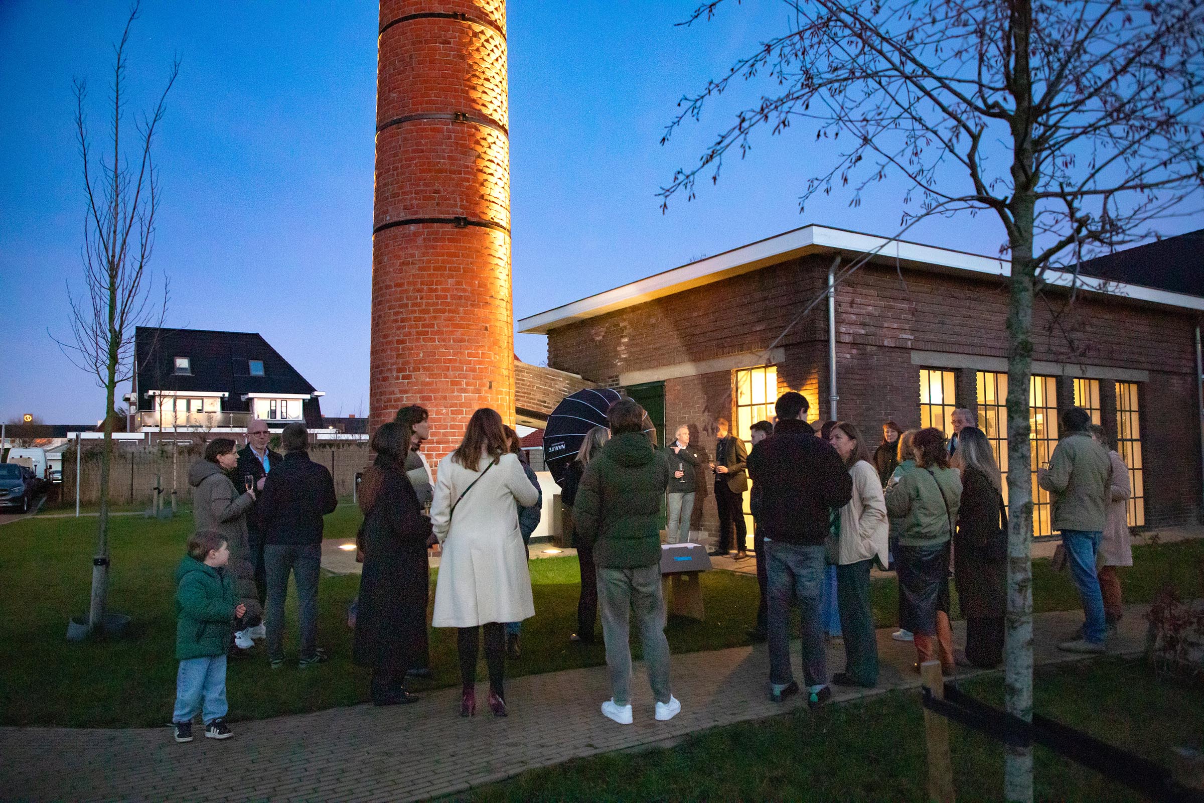 Gezamenlijk werd om 17.00 uur de rode knop ingedrukt en de schoorsteen spectaculair aangelicht. Dat was tevens het moment om de dag met een glas champagne feestelijk af te sluiten. De tientallen toeschouwers waren niet voor niets komen gekomen.